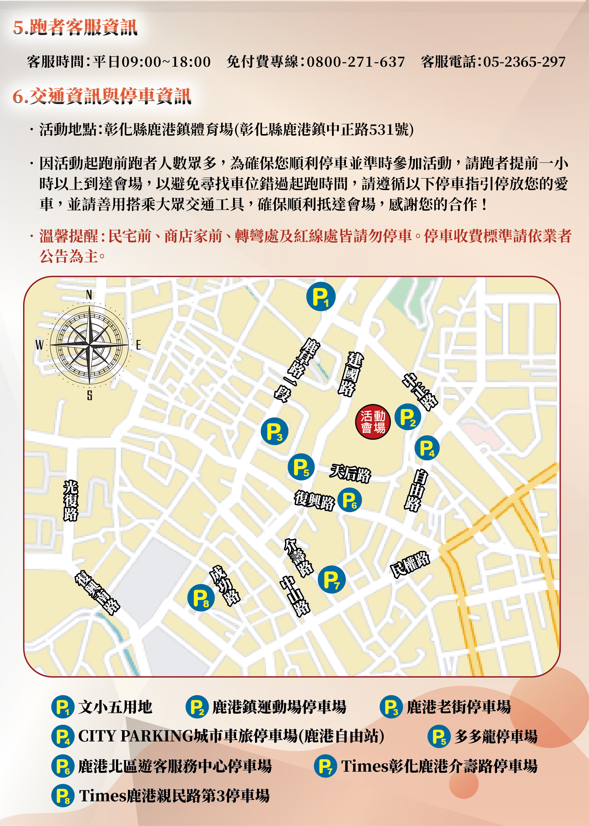 - 因活動起跑前跑者人數眾多,為確保您順利停車並準時參加活動,請跑者提前一小時以上到達會場,以避免尋找車位錯過起跑時間,請遵循以下停車指引停放您的愛車,並請善用搭乘大眾交通工具,確保順利抵達會場,感謝您的合作!