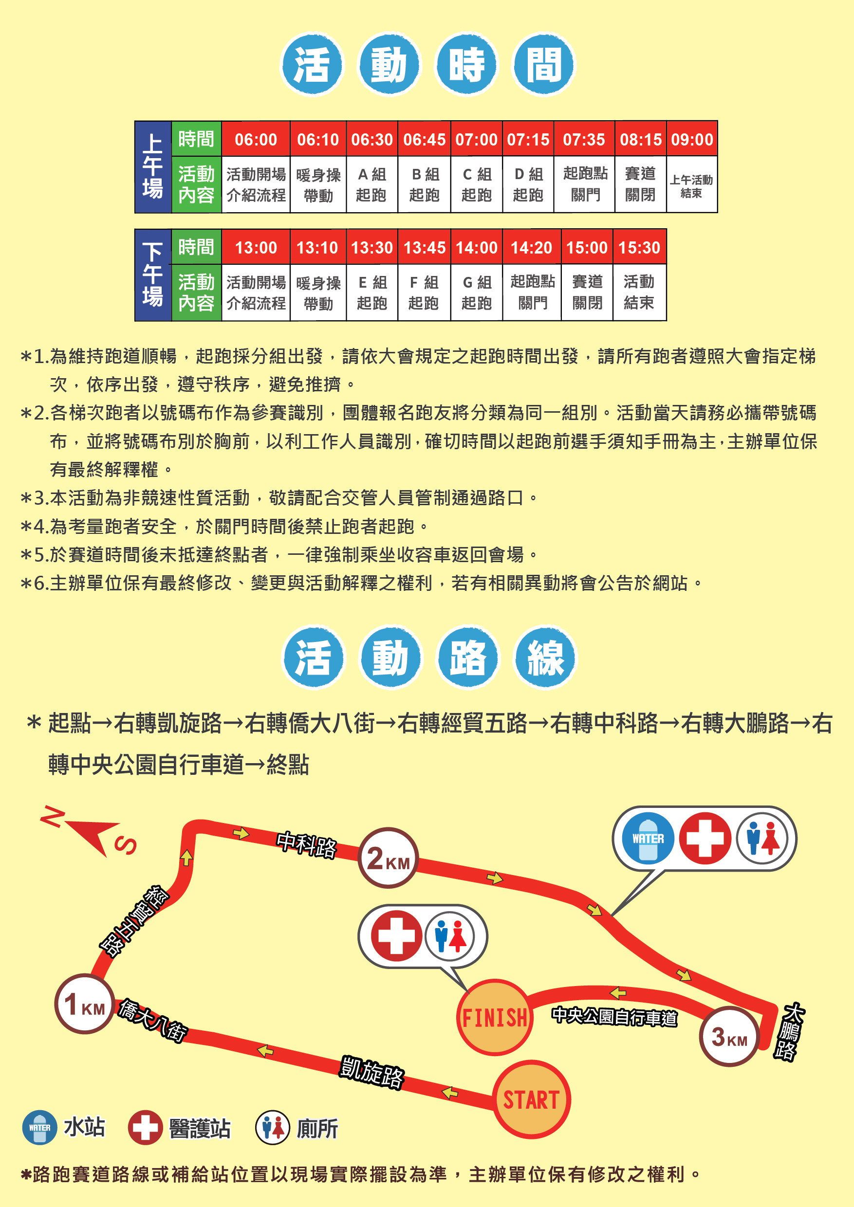 ※1.為維持跑道順暢,起跑採分組出發,請依大會規定之起跑時間出發,請所有跑者遵照大會指定梯次,依序出發,遵守秩序,避免推擠。