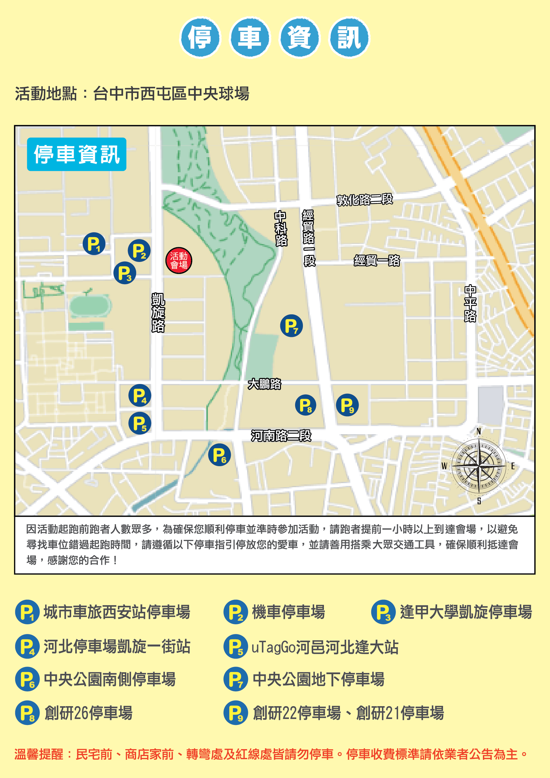 - 因活動起跑前跑者人數眾多,為確保您順利停車並準時參加活動,請跑者提前一小時以上到達會場,以避免尋找車位錯過起跑時間,請遵循以下停車指引停放您的愛車,並請善用搭乘大眾交通工具,確保順利抵達會場,感謝您的合作!