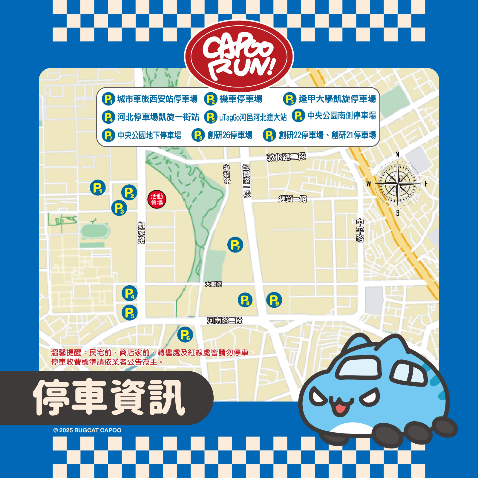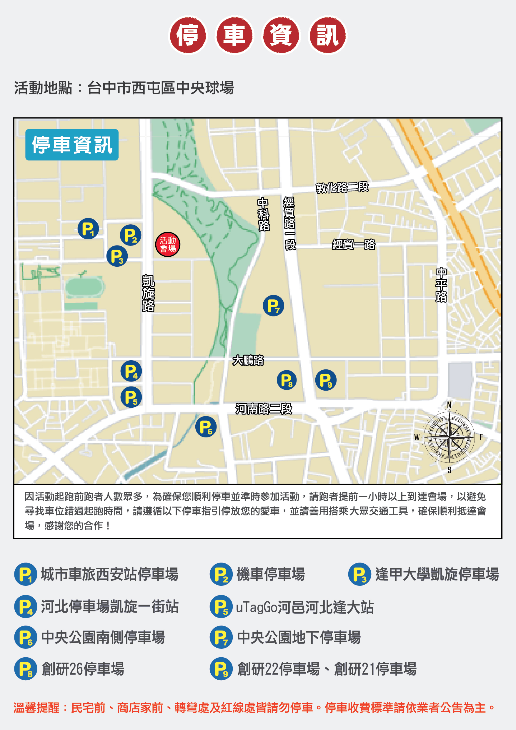 - 因活動起跑前跑者人數眾多,為確保您順利停車並準時參加活動,請跑者提前一小時以上到達會場,以避免尋找車位錯過起跑時間,請遵循以下停車指引停放您的愛車,並請善用搭乘大眾交通工具,確保順利抵達會場,感謝您的合作!