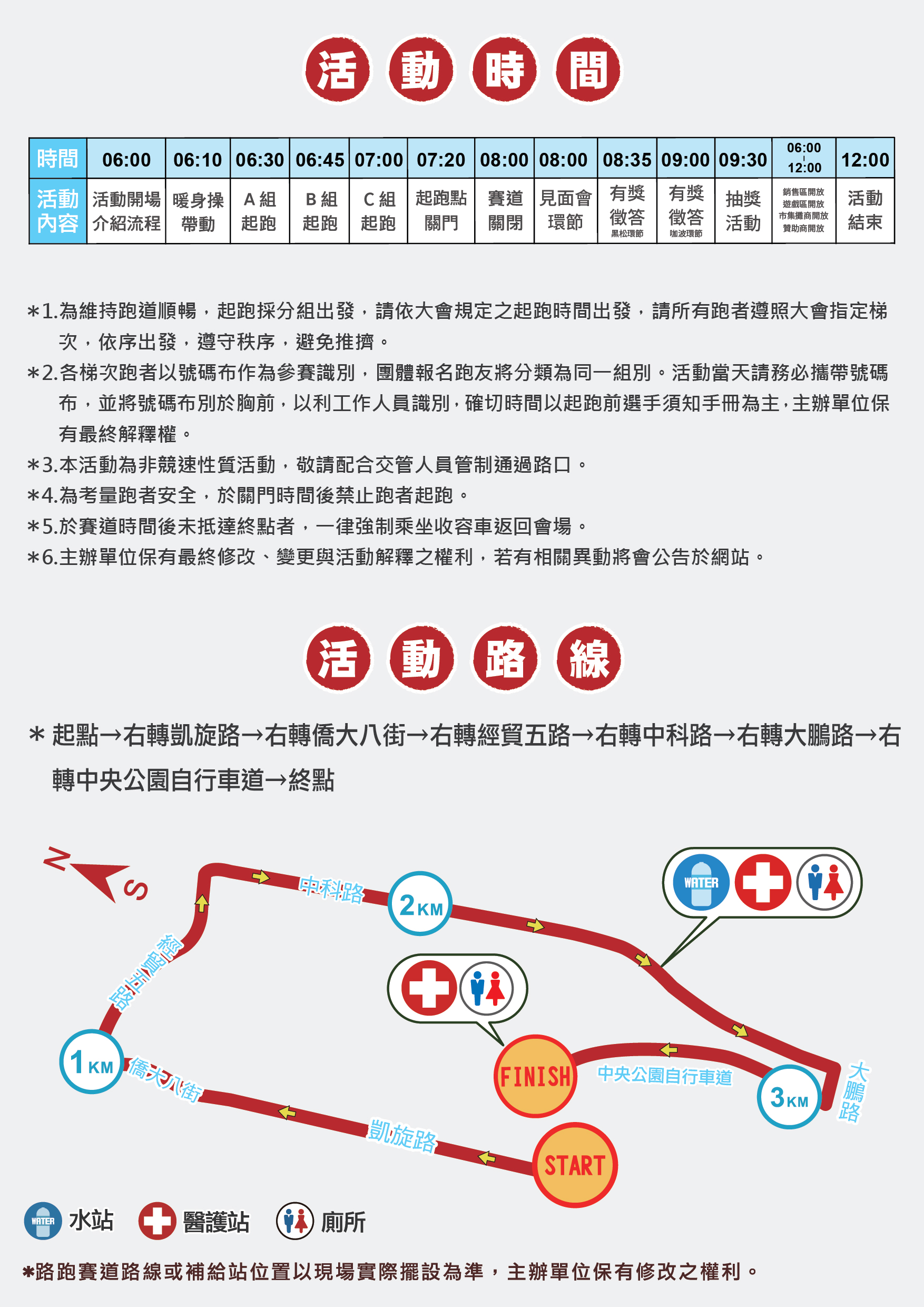 ※1.為維持跑道順暢,起跑採分組出發,請依大會規定之起跑時間出發,請所有跑者遵照大會指定梯次,依序出發,遵守秩序,避免推擠。