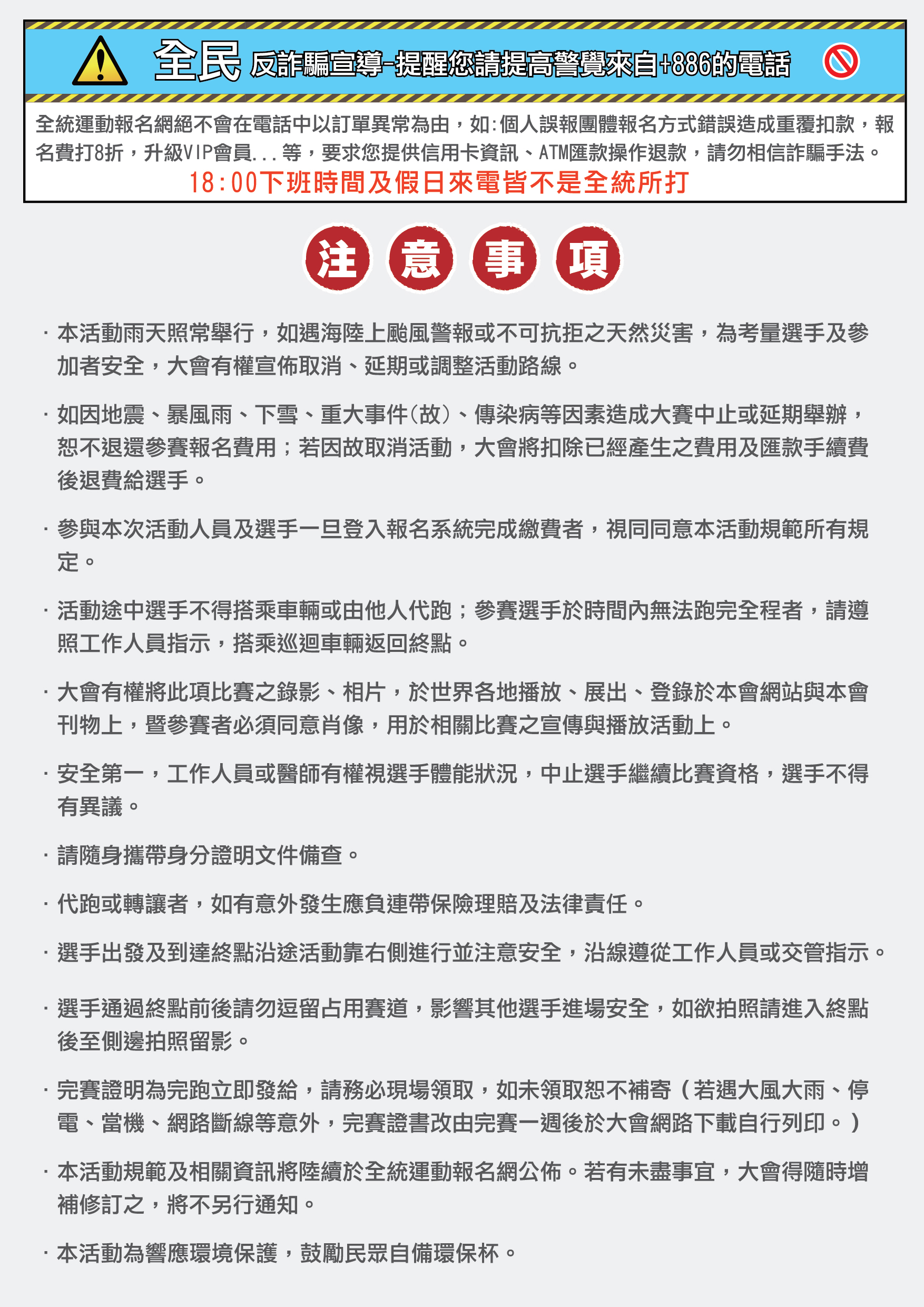 - 物資、號碼布若有缺漏請最慢於活動前三日致電全統報名網客服反應登記,否則一律視為遺失處理現場不補發。