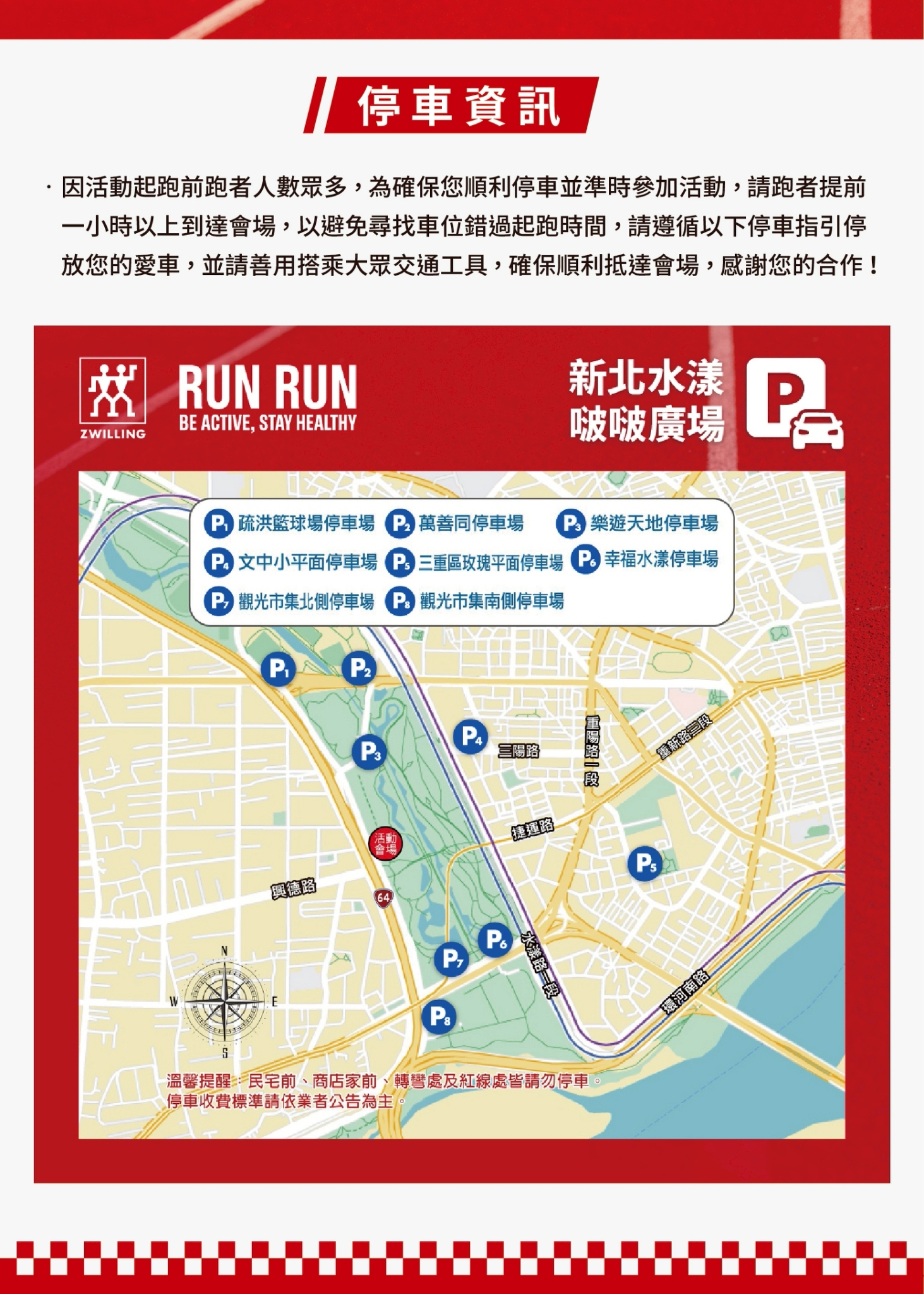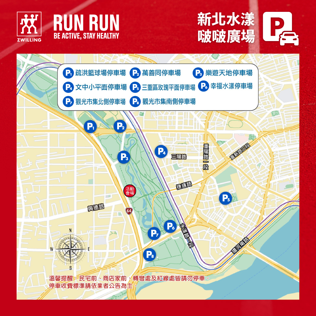 - 因活動起跑前跑者人數眾多,為確保您順利停車並準時參加活動,請跑者提前一小時以上到達會場,以避免尋找車位錯過起跑時間,請遵循以下停車指引停放您的愛車,並請善用搭乘大眾交通工具,確保順利抵達會場,感謝您的合作!