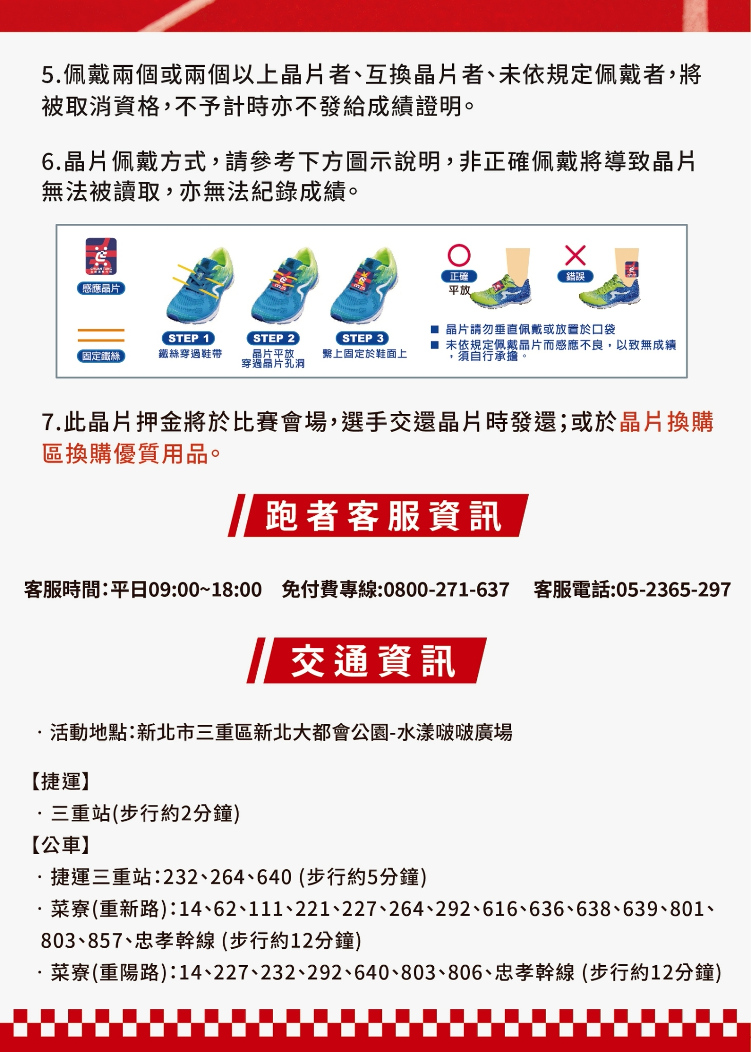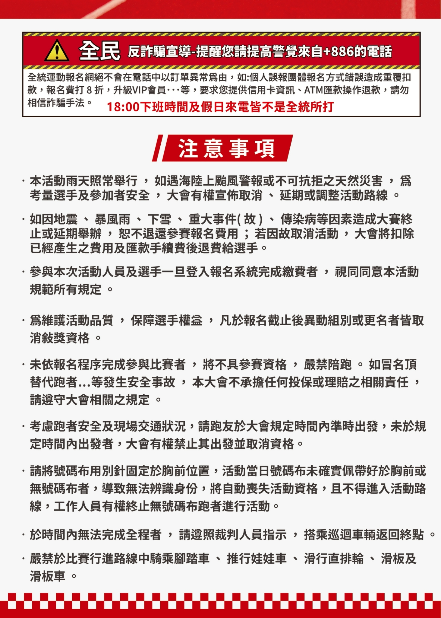 - 物資、號碼布若有缺漏請最慢於活動前三日致電全統報名網客服反應登記,否則一律視為遺失處理現場不補發。