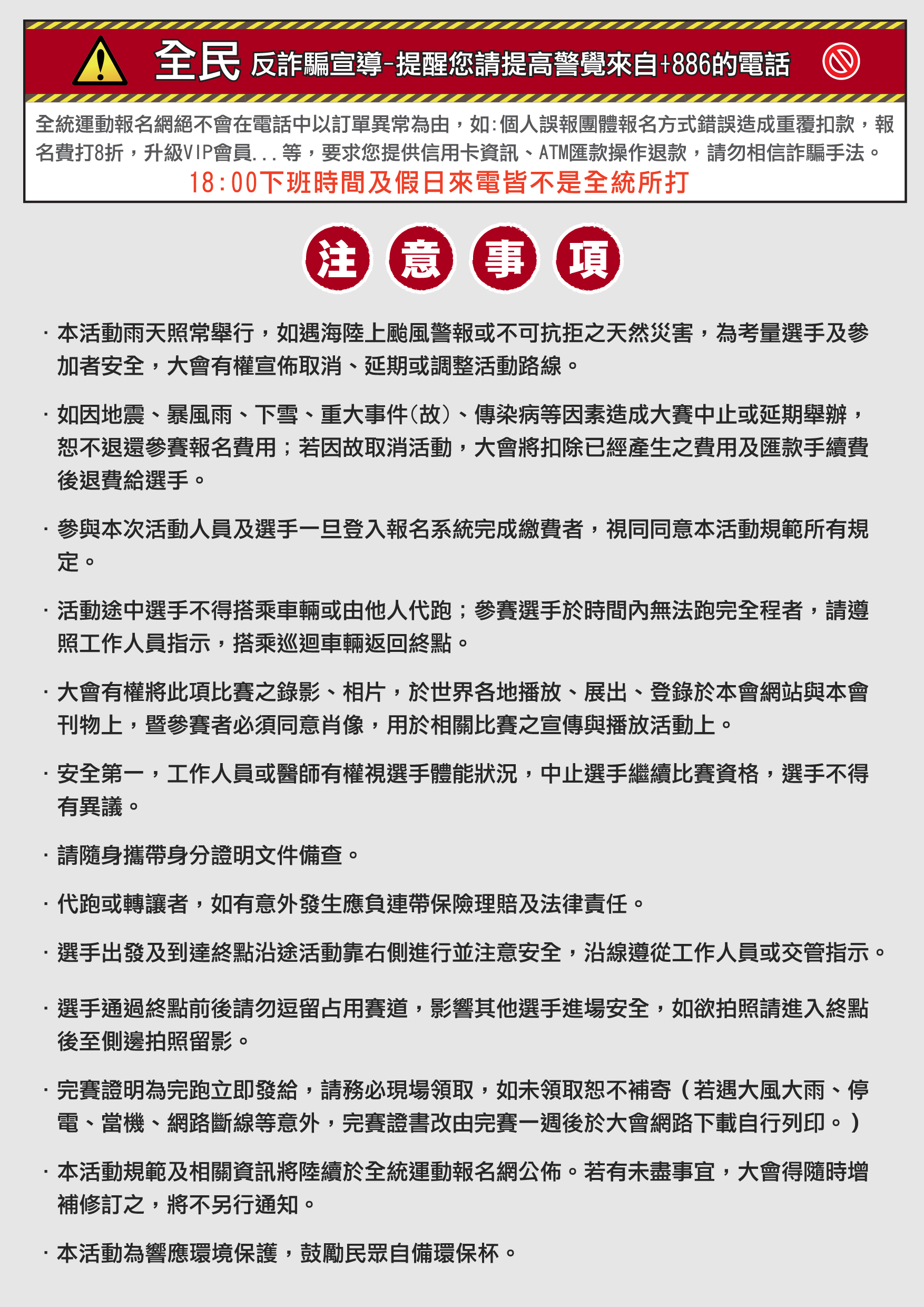 - 物資、號碼布若有缺漏請最慢於活動前三日致電全統報名網客服反應登記,否則一律視為遺失處理現場不補發。