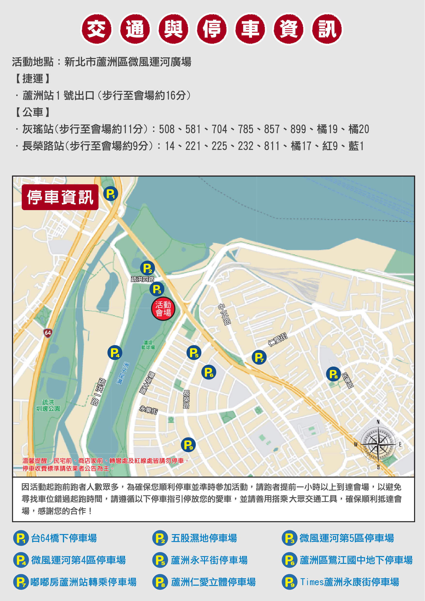 - 因活動起跑前跑者人數眾多,為確保您順利停車並準時參加活動,請跑者提前一小時以上到達會場,以避免尋找車位錯過起跑時間,請遵循以下停車指引停放您的愛車,並請善用搭乘大眾交通工具,確保順利抵達會場,感謝您的合作!