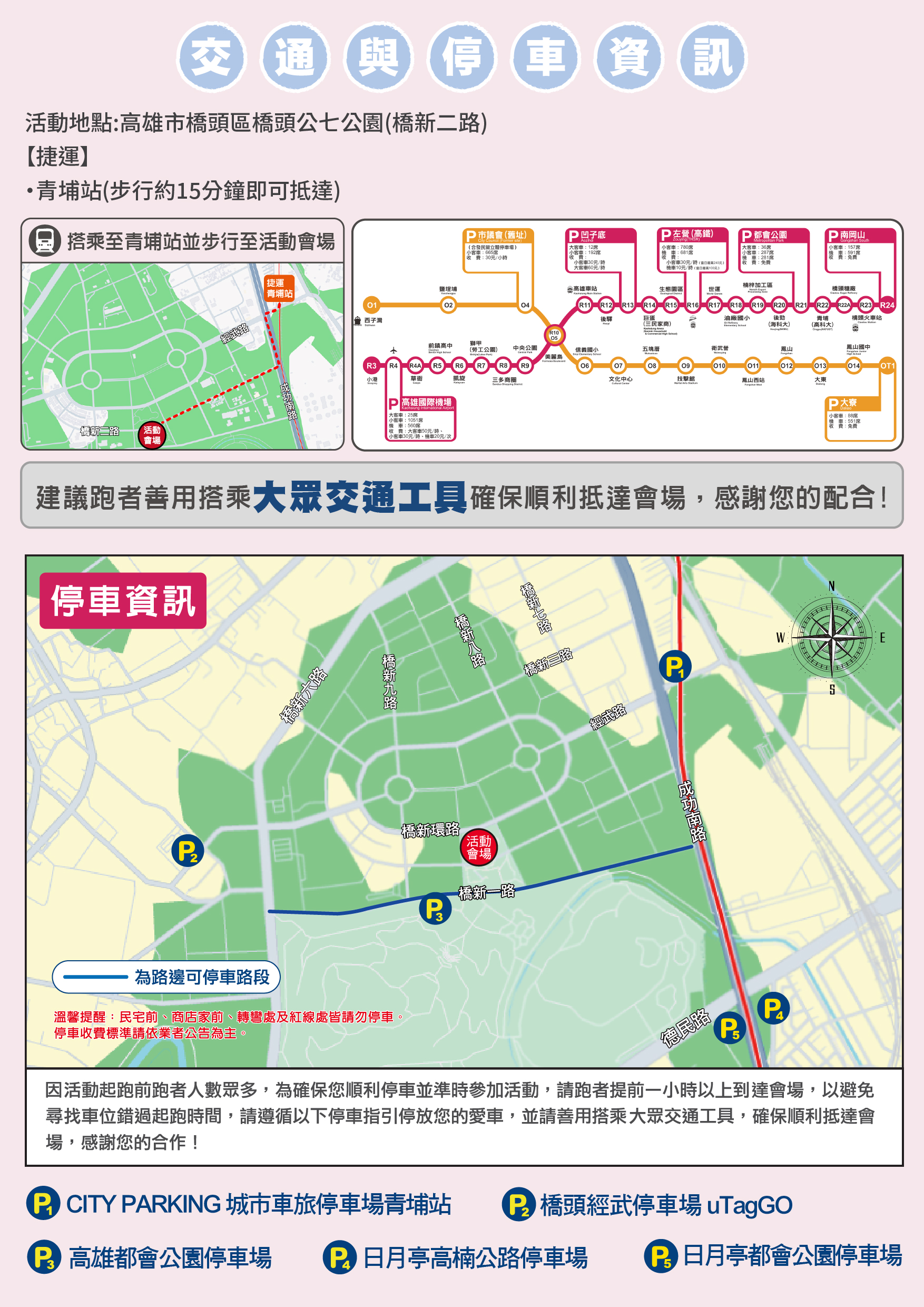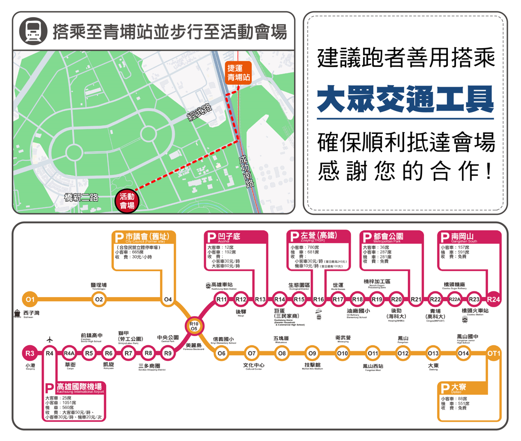 - 因活動起跑前跑者人數眾多,為確保您順利停車並準時參加活動,請跑者提前一小時以上到達會場,以避免尋找車位錯過起跑時間,請遵循以下停車指引停放您的愛車,並請善用搭乘大眾交通工具,確保順利抵達會場,感謝您的合作!