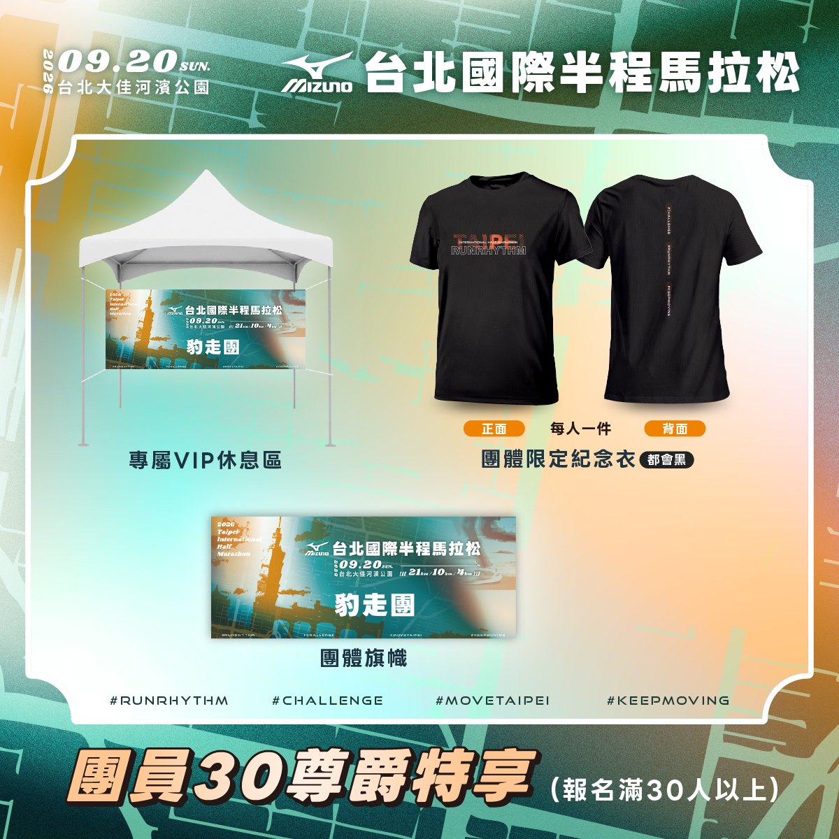 前 20 名團體:尊享 VIP 專屬休息帳篷與客製化團體旗幟,讓你的團隊成為焦點。