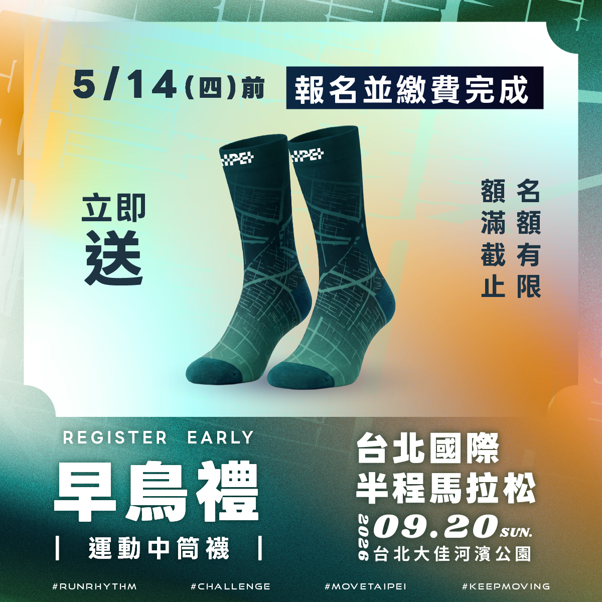 早鳥報名禮:中筒運動襪 乙雙(隨機不挑色)。