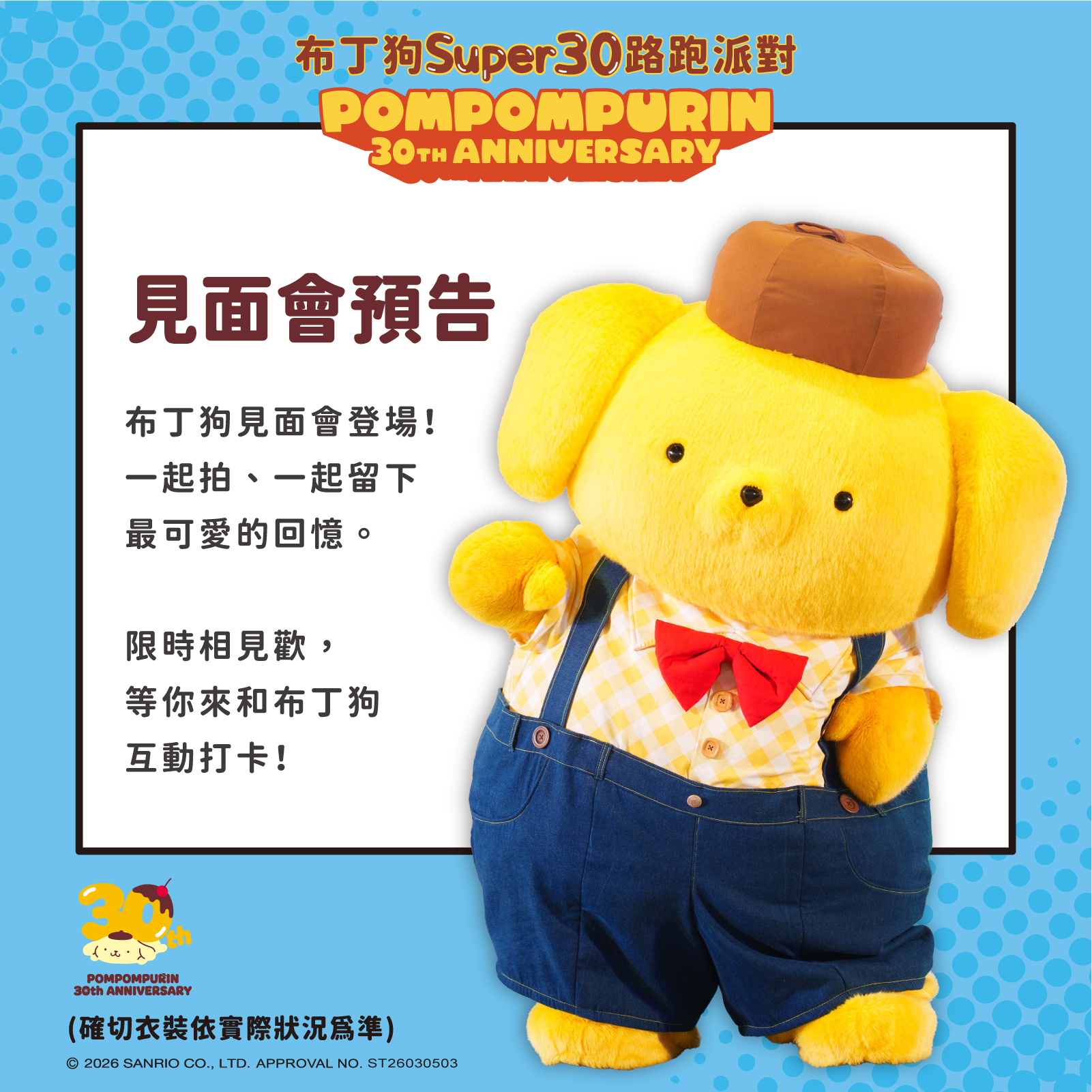 本次活動最大亮點在於30週年限定的超級英雄布丁狗造型——此款式僅在30週年推出,披上披風的布丁狗將以「Pom Pom Power」為主軸,號召粉絲一起跑出快樂能量、衝向歡樂終點線。活動現場設有30週年限定慶生布置、主題背板合照區,以及粉絲期待已久的布丁狗見面會。
